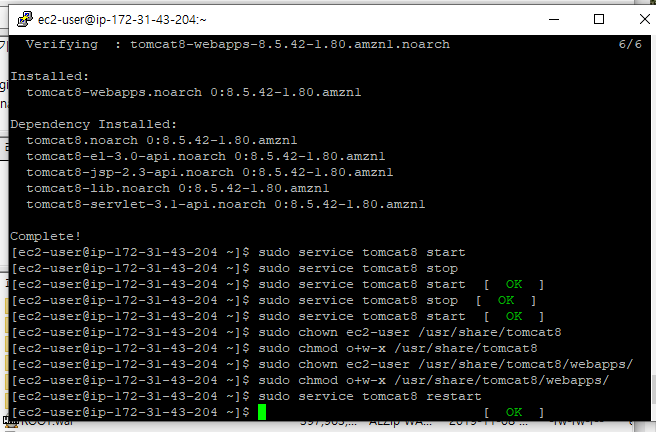 - 순서정리 : ec2인스턴스 생성 및 시작 -> 보안그룹 설정(인바운드 규칙) -> java 버전업그레이드 -> 톰캣 설치 -> war파일 톰캣경로에 저장 -> 톰캣 start