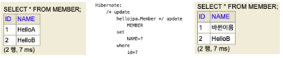 - JPA가 관리하는 엔티티에 변경사항이 생기면 인식해서 commit시에 update쿼리를 생성해서 수행해줌