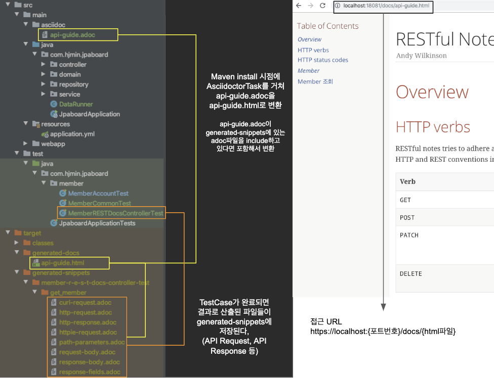 - Asciidoctor로 직접 작성한 문서와 Spring MVC 테스트를 통해 자동 생성된 스니펫을 결합해서 웹 문서를 만든다.