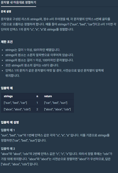 문자열 내 마음대로 정렬하기 (프로그래머스) - 완료 본문
